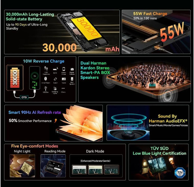Камера основна 108 Mpx, фронтальна 50 Mpx. Підтримка 2 сім-картки або 1 сім-карти + Sd карта до 2Тб, розмір екрана 10,95 дюймів, Android 14. Підтримка швидкого заряджання 55 Вт. Може зарядити інші пристрої, у такий спосіб слугує як Павербанк. Повний захист IP68, IP69K, військовий захист MIL-STD-810H стійкість до ударів, падінь, високих і низьких температур, вологи, води, пилу, вібрації та іншого. Вбудовані 4-ре динаміки видають солідне звучання й дають змогу слухати музику, відео на глибоких басах — обладнаний стереодинаміками Harman/Kardon. Підтримка режиму робота в рукавичках.